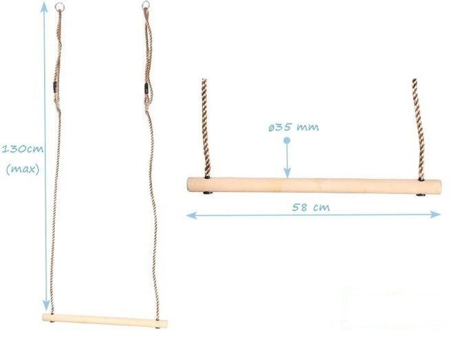 Un trapezio in legno molto originale e delizioso, che offrirà un ottimo divertimento a tutti i bambini. La sua funzionalità consente di praticare l'oscillazione tradizionale, ma anche il pull up, l'appendimento e altri esercizi per migliorare la forma fisica. L'accurata lavorazione e l'utilizzo di materiali di alta qualità garantiscono ulteriormente la sicurezza dei vostri bambini. Il trapezio di legno è ampiamente utilizzato in vari tipi di costruzione.